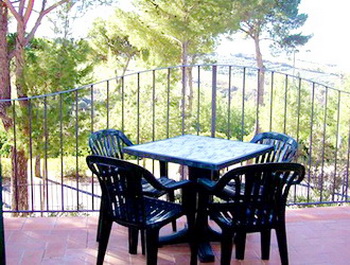 Von hier genießt man die Lage im Pinienwald mit herrlichem Blick über die Hügel und das Meer.