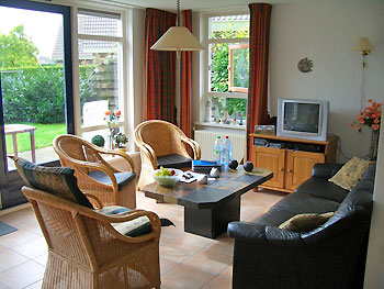 Das Ferienhaus hat ca. 70 qm. Im Erdgeschoss befinden sich die Diele mit Gäste-WC und Abstellraum, sowie das zum Wasser gelegene großzügige Wohnzimmer mit Fernseher mit SAT-TV, Essecke mit offener Küche, Mikrowelle, Mini-Backofen, Gasherd mit vier Kochstellen, eine Kaffeemaschine und ein Kühlschrank mit kleinem Gefrierfach.